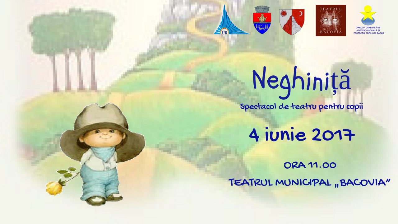 Prima manifestare, desfăşurată graţie artiştilor de la Teatrul Municipal „Bacovia", propune spectatorilor băcăuani, duminică 4 iunie 2017, la ora 11, un spectacol de teatru de animaţie, cu intrare pe bază de invitaţie, pentru a celebra Ziua Internaţională a Copilului. Micii spectatori din centrele de protecţie aparţinând de DGASPC Bacău şi de la Asociaţia Sindrom Down Bacău sunt invitaţi la Teatrul Municipal „Bacovia" împreună cu familiile, prietenii şi educatorii lor, să îl descopere pe Neghiniţă, într-o punere în scenă de excepţie. Vor păși astfel în lumea basmului pentru a înţelege cât de importantă este naşterea unui copil diferit, dar cu totul special, ca fiecare dintre ei.