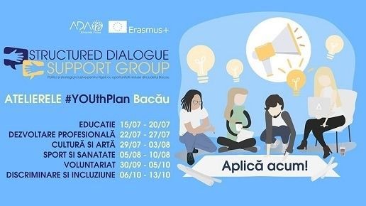 Atelierele #YOUthPlan Bacău sunt organizate de către Asociația pentru Dezvoltare Activă ADA în cadrul proiectului SDSG - Politici si strategii incluzive pentru tinerii din judetul Bacau, proiect finanțat de către Uniunea Europeană prin Programul Erasmus+RO, Acțiunea Cheie 3 – #DialogStructurat. Domeniile pe care se axează seria de ateliere desfășurate în perioada iulie-octombrie 2019 sunt: