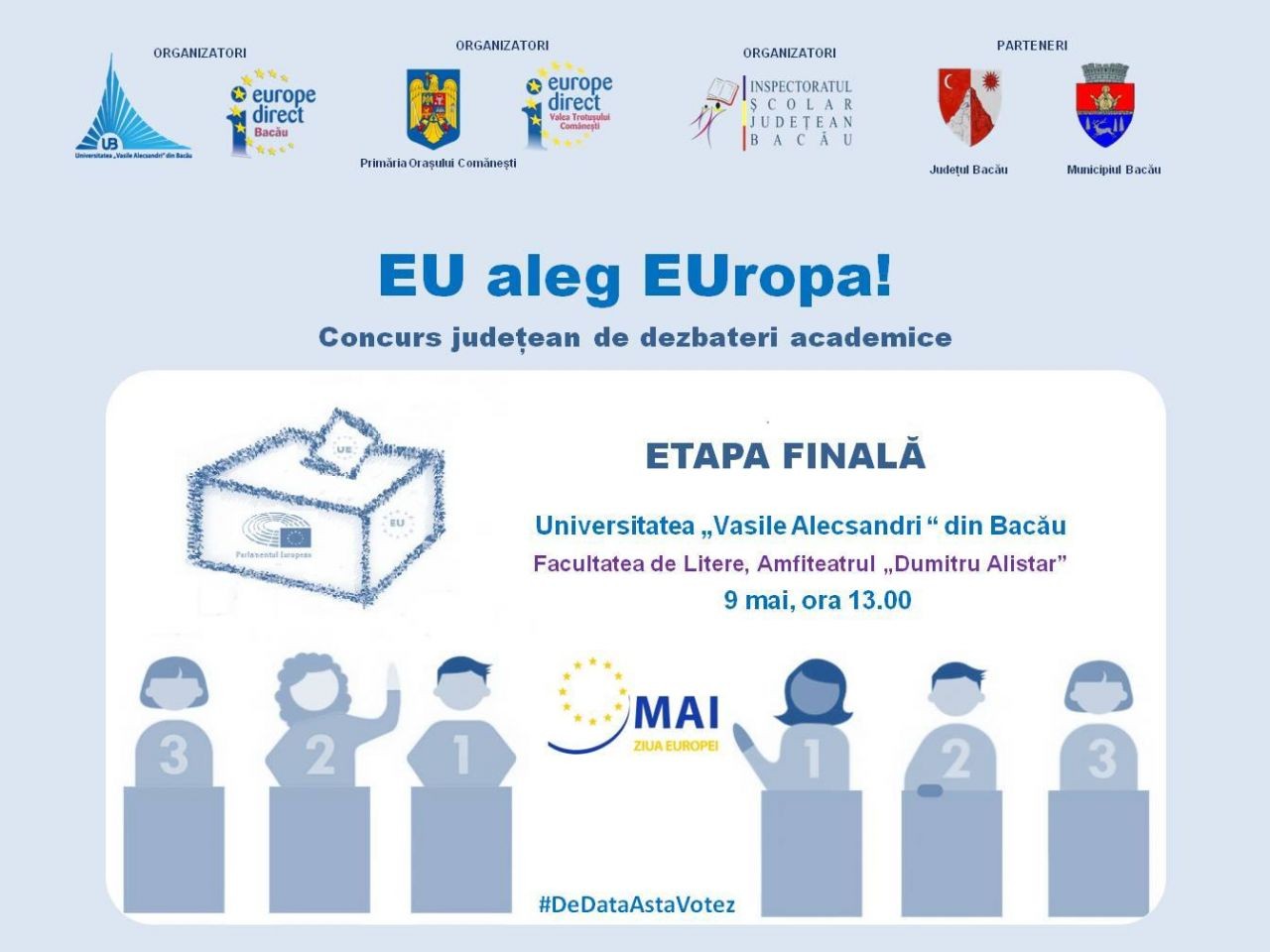 Liceenii băcăuani care au participat la concursul EU ALEG EUROPA!, organizat de Centrele de informare Europe Direct Bacău si Valea Trotușului-Comănești în parteneriat cu Inspectoratul Școlar Județean Bacău, au dat cea mai bună dovadă cât de pregătiți sunt să își asume un rol activ în calitate de cetățeni europeni. Argumentele lor pentru susținerea importanței votului la Alegerile europarlementare 2019 (aparand motiunea "Viitorul UE depinde de votul tinerilor la Alegerile europarlamentare 2019") au fost extrem de puternice și de convingătoare. La finala de pe 9 mai, chiar de Ziua Europei, felicitările au fost binemeritate atât pentru ocupantele locurilor I și II (Colegiul Național "Ferdinand I" Bacău și Colegiul Național "Costache Negri" Târgu-Ocna) cât și pentru celelalte 14 echipe care au luat parte la acest concurs. Puteți urmări finala concursului pe canalul de YouTube, pe linkul  de mai jos.