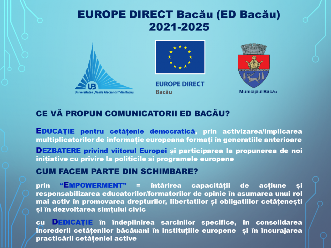 Pe 30 aprilie, am adus prinosul de recunoștință pentru ceea ce a însemnat în viețile noastre și ale voastre CIED Bacău, astăzi aducem vestire că EUROPE DIRECT Bacău prinde din nou viață prin voi și pentru voi. Și pentru că deschiderea noului centru ED Bacău găzduit de Universitatea Alecsandri din Bacău se face, simbolic, în această zi cu dublă semnificație (Sărbătorile pascale ortodoxe și Ziua Muncii), haideți să îl păstrăm viu în conștiința băcăuanilor, încă 5 ani de-acum încolo, prin lucrarea împreună!