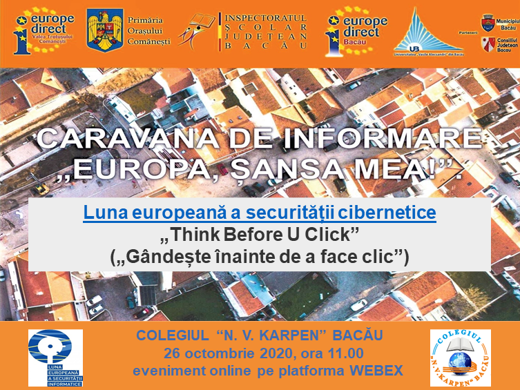 Caravana de informare „Europa, șansa mea", desfășurată de Centrele de Informare Europeană Europe Direct Valea Trotușului Comănești și Europe Direct Bacău ajunge online la Colegiul „N. V. Karpen" Bacău, pentru a promova securitatea online în rândul cetățenilor UE în cadrul Lunii europene a securității cibernetice.