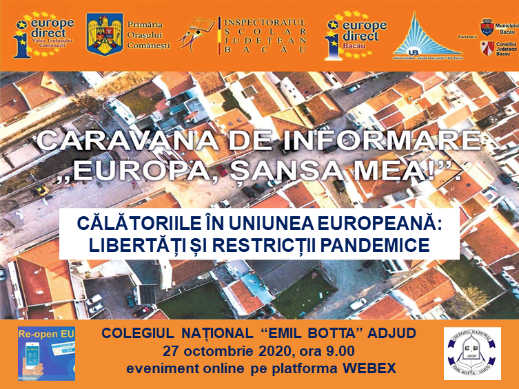 Mergând pe linia uneia dintre prioritățile Comisiei Europene pentru 2019-2024 - Promovarea modului nostru de viață european - Caravana de informare „Europa, șansa mea", desfășurată de Centrele de Informare Europeană Europe Direct Valea Trotușului Comănești și Europe Direct Bacău și-a propus să promoveze la Colegiul Național „Emil Botta" din Adjud instrumentele online puse la dispoziție pe platforma „Re-open EU". Lansată de Comisia Europeană încă din iunie, platforma oferă informații despre norme, restricții sau permisiuni de călătorie adoptate pe teritoriul UE, precum și măsuri de protecție a sănătății și siguranței publice în contextul pandemiei de COVID-19. Pe lângă facilitarea accesului la informații corecte și actualizate, ne dorim să întărim sentimentul că se fac eforturi susținute pentru ca limitarea sau condiționarea dreptului de a călători în străinătate să se facă într-o manieră reglementată unitar la nivelul european, doar atunci când se impune și pentru protecția cetățenilor europeni.