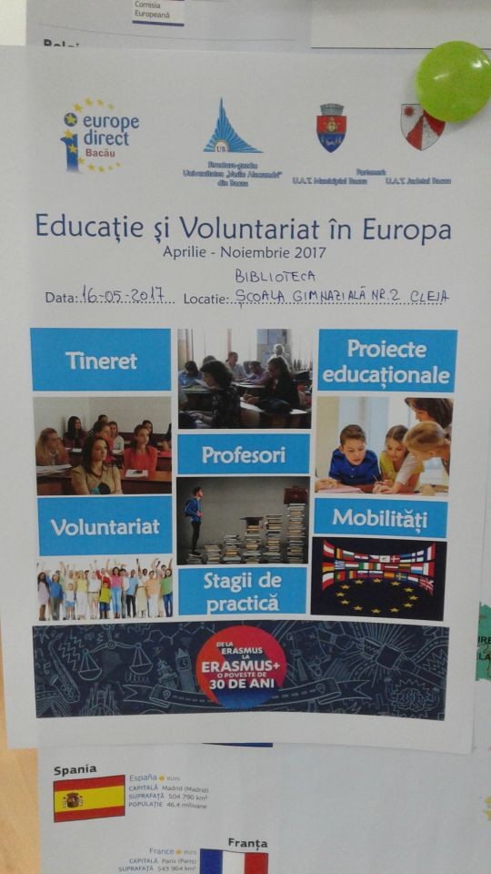 Activitățile au fost coordonate de prof. Irimia Vasilica-Petronela – profesor documentarist; prof. Doboş Gabriel- profesor de geografie și prof. Doboş Monica – profesor de geografie, iar locațiile activităților au fost Şcoala Gimnazială Cleja(Centrul de Documentare şi Informare „Mihai Eminescu"), Şcoala Gimnazială Nr. 2 Cleja (bibliotecă) și Şcoala Gimnazială Somuşca (sală de clasă). Materiale vizuale și tematice au fost oferite tuturor participanților, acestea fiind puse la dispoziție de către Centrul Europe Direct Bacău. Mulțumim cadrelor didactice și elevilor pentru deschidere și pentru frumoasa inițiativă.