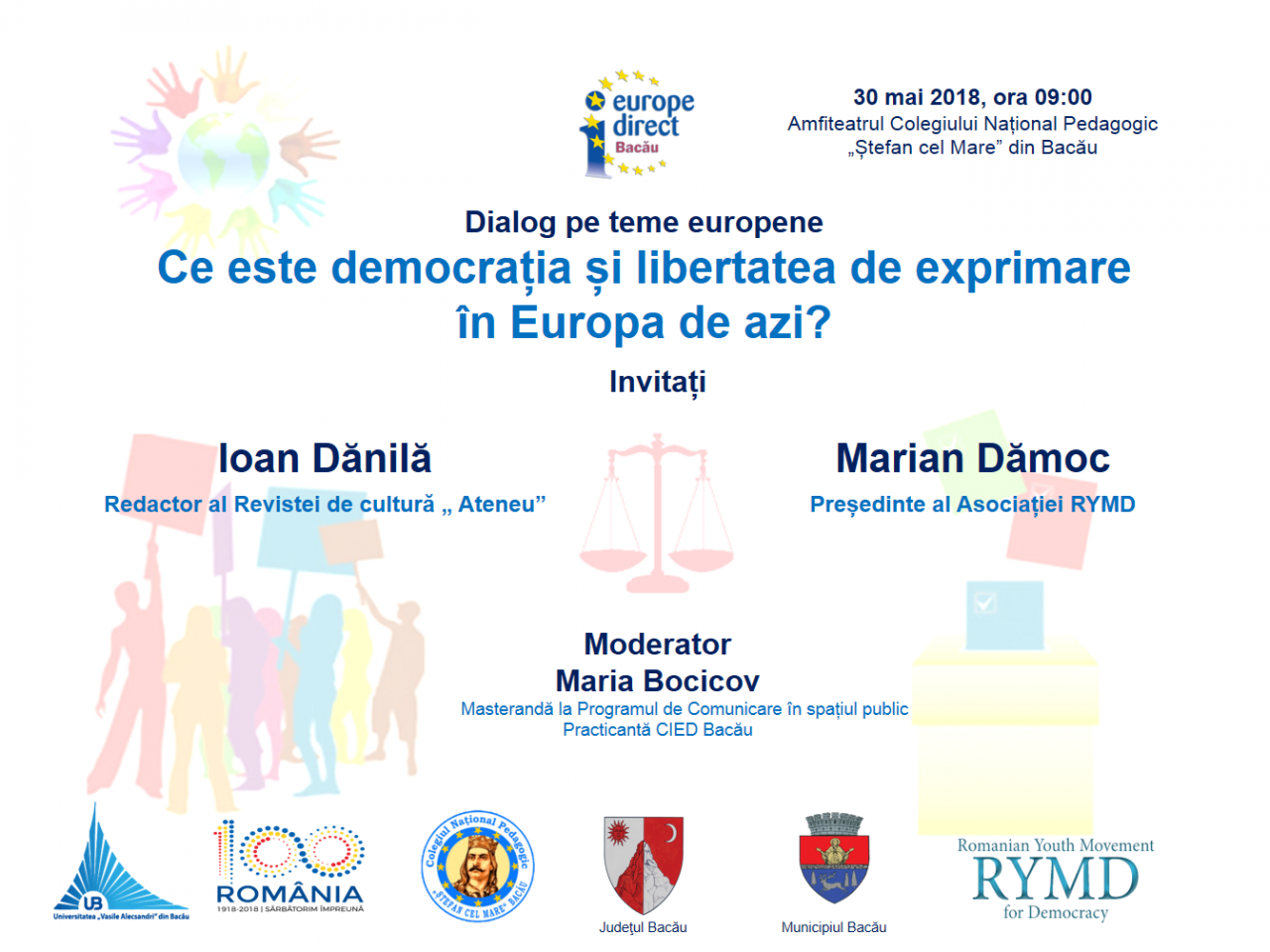 Vă puteți alătura acestora miercuri 30 mai, începând cu ora 9, la Colegiul Național Pedagogic „Ștefan cel Mare" din Bacău, gazda dialogului nostru, unde îi vom avea ca invitați pe domnul Ioan Dănilă, în calitate de redactor al Revistei de cultură „Ateneu" și cronicar la cotidianul „Deșteptarea", alături de domnul Marian Dămoc, președinte al Asociației RYMD (Romanian Youth Movement for Democracy – o asociație foarte activă în promovarea valorilor democratice și a participării active la viața comunității).