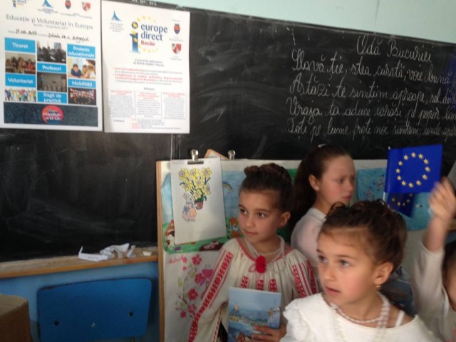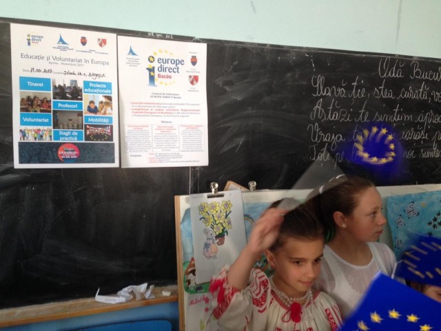 Aceste activități au fost prefațate de prezentarea dnei conf. univ. dr. Luminița Druga din partea Centrului „Europe Direct" Bacău, menită să explice într-un limbaj accesibil celor mai mici cetățeni europeni ce înseamnă de fapt Uniunea Europeană şi să îi ajute să descopere „misterul" steluțelor aurii de pe steagul Uniunii Europene.