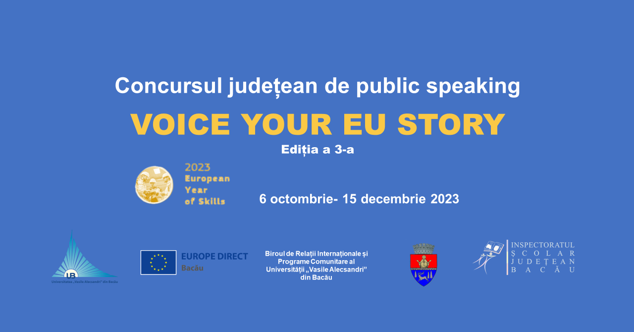 Centrul EUROPE DIRECT Bacău, în colaborare cu Inspectoratul Școlar al Județului Bacău și Biroul de Relații Internaționale și Programe Comunitare al Universității „Vasile Alecsandri" din Bacău invită tinerii băcăuani să se înscrie la concursul de public speaking în limbile română și engleză "Voice your EU story", unde vor avea șansa de a transmite răspunsul lor la problema schimbărilor climatice într-un speech cu o tentă motivațională.