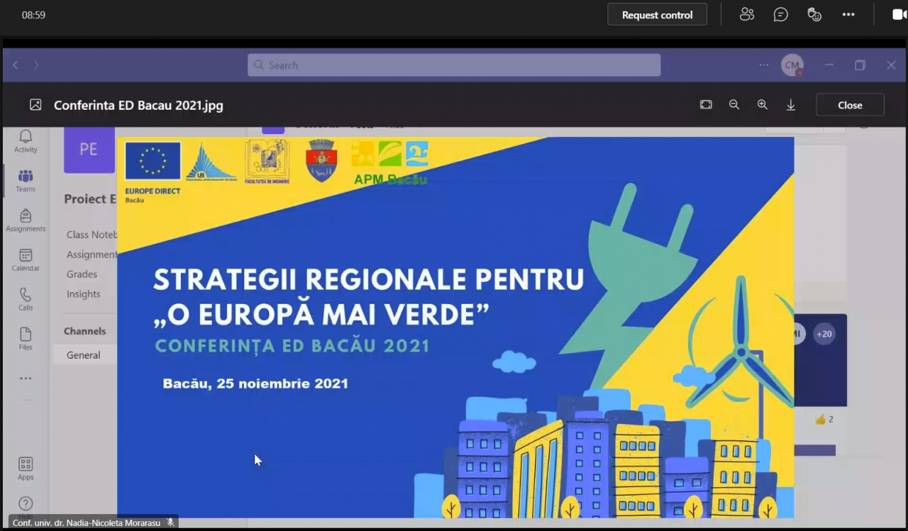 Conferința online Strategii regionale pentru o Europă mai verde", organizată de Centrul EUROPE DIRECT (ED) Bacău (găzduit de Universitatea „Vasile Alecsandri" din Bacău în parteneriat cu Municipiul Bacău), în colaborare cu Facultatea de Inginerie a Universității "Vasile Alecsandri" din Bacău și Agenția pentru Protecția Mediului Bacău, a reunit pe 25 noiembrie, în spațiul virtual, peste 50 de specialiști care au avut pus în discuție strategii prin care Pactul Verde European poate transforma provocările climatice și de mediu în oportunități de a avea noi standarde în materie de durabilitate și calitate a vieții.