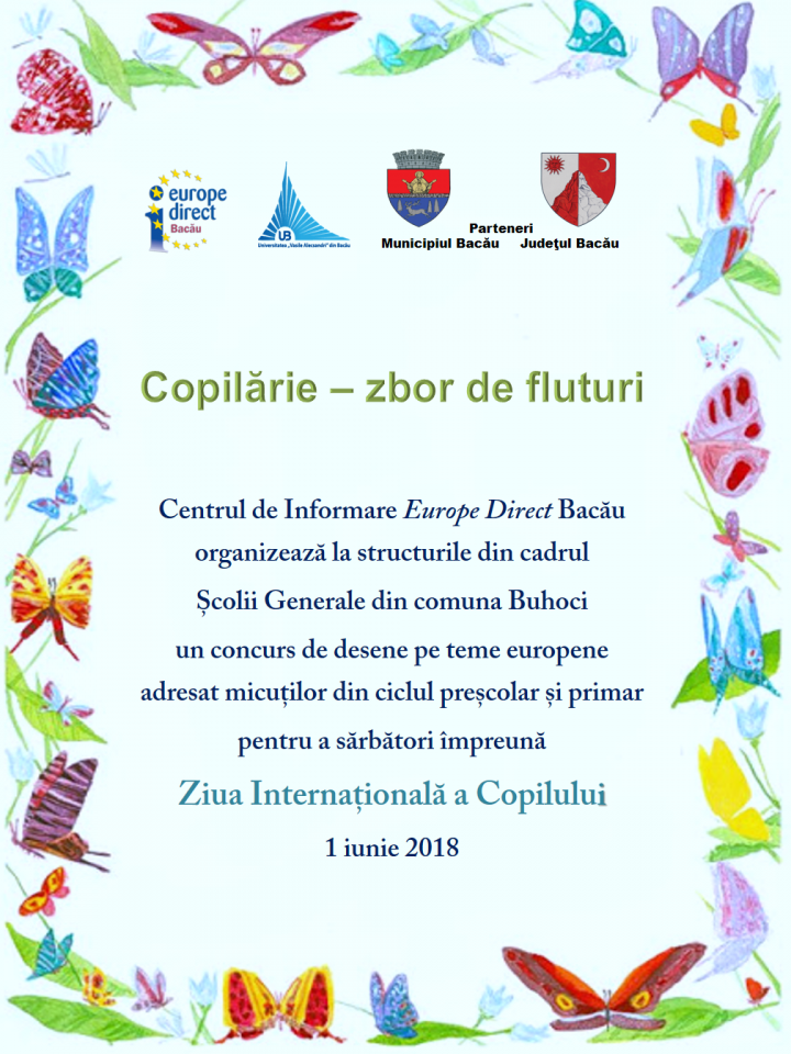 Ce perioadă e mai frumoasă în viața omului decât cea a copilăriei? Niciuna, vor spune cei mai mulți dintre noi. Ce zi din an e cea mai plăcută de copii? Ziua de 1 Iunie, au răspuns în cor preșcolarii și elevii de la Școala Gimnaziala Buhoci și Structura Bijghir, județul Bacău. În aceste două unități școlare, echipa Centrului de Informare Europe Direct Bacău a organizat concursul de desene pe tema „Copilărie – zbor de fluturi", concurs la care au participat preșcolari și școlari din învățământul preșcolar și primar de la școlile amintite. Mesajul pe care s-a axat această activitate este acela că fiecare copil european ar trebui să simtă că îi sunt respectate drepturile de protecție, dezvoltare și participare, astfel încât să zboare în viață la fel de liber ca un fluture multicolor. Efortul copiilor a fost răsplătit cu pachete cu produse alimentare și materiale (cărți, cretă, stegulețe) care le-au încântat ochii și le-au bucurat inimile.