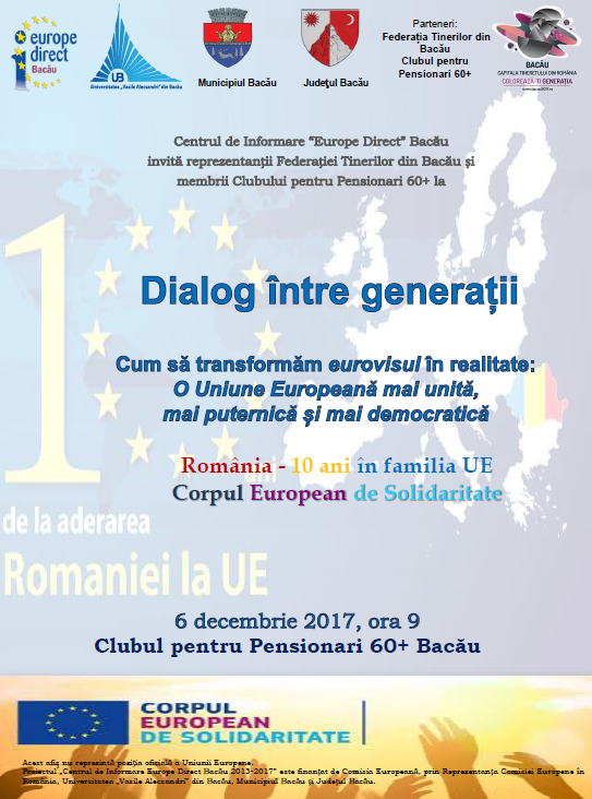 În contextul aniversării a zece ani de la aderarea României la Uniunea Europeană și a unui an de la lansarea Corpului European de Solidaritate, Centrul de Informare „Europe Direct" Bacău invită reprezentanții Federației Tinerilor din Bacău și membrii Clubului pentru Pensionari 60+, pe 6 decembrie la ora 9, la un Dialog între generații pe tema Cum să transformăm eurovisul în realitate: O Uniune Europeană mai unită, mai puternică și mai democratică"La acest dialog participă din partea Federației Tinerilor Mihaela Enea și Lucian Popa.