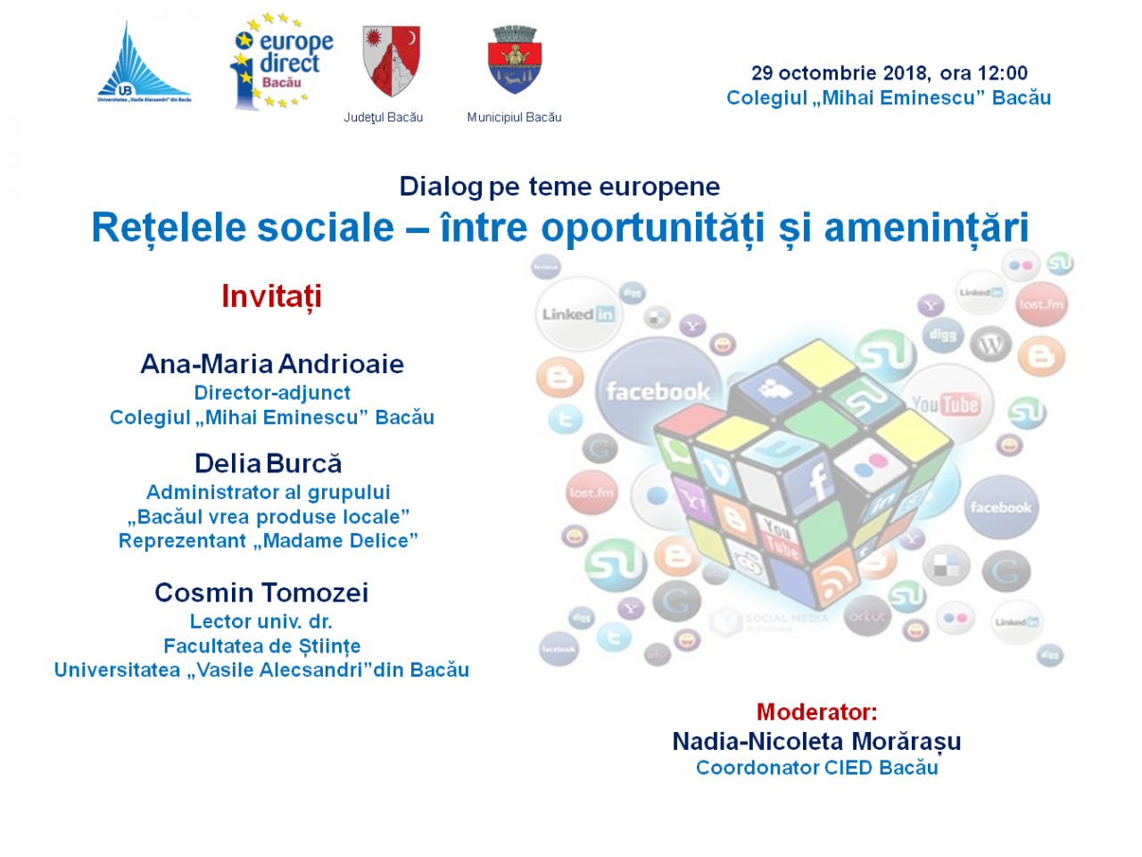 Centrul de Informare Europe Direct Bacău vă invită să celebrăm Ziua Internațională a Internetului prin dialogul cu tema Rețelele sociale – între oportunități și amenințări, care se va desfășura la Colegiul Național „Mihai Eminescu", pe 29 octombrie 2018, începând cu ora 12.00.