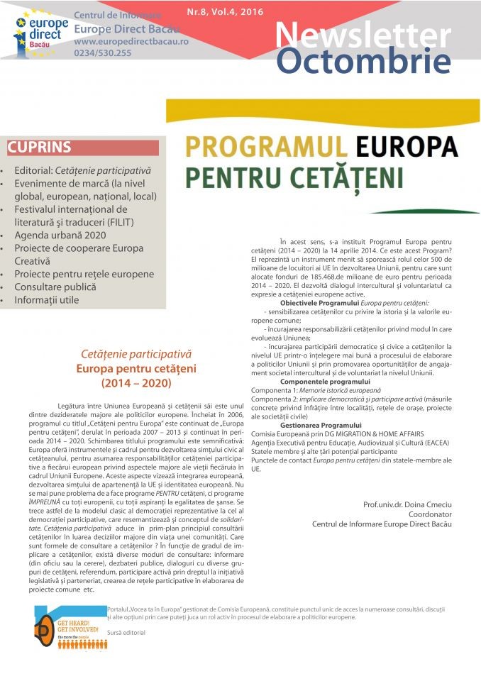 La link-ul de mai jos puteți accesa și descărca direct publicația lunară. Documentul este de tip PDF INTERACTIVE, ceea ce presupune că link-urile inserate se vor deschide direct în momentul în care dați click pe ele (în text sunt evidențiate printr-un cadru negru, pentru text, și cadru roșu, pentru imagini).