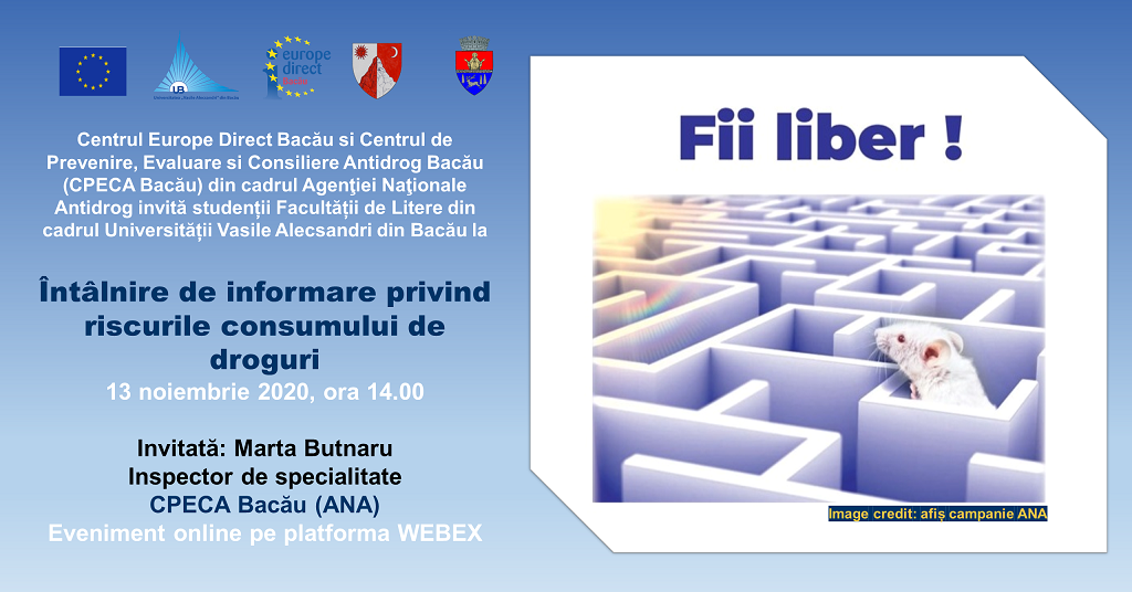 Studenții programului de conversie profesională PIPP II din cadrul Universității "Vasile Alecsandri" din Bacău au participat de asemenea vineri, 13 noiembrie 2020, începând cu ora 15.00, la o doua sesiune de informare privind riscurile consumului de droguri, organizată de Centrul de Informare Europe Direct Bacau în colaborare cu Centrul de Prevenire, Evaluare si Consiliere Antidrog Bacău (CPECA Bacău) al Agenţiei Naţionale Antidrog. Cu acest prilej, doamna inspector de specialitate Marta Butnaru de la CPECA Bacău va realiza o prezentare interactivă, folosind materiale adaptate specificului educațional și social al participanților, în scopul creşterii gradului de informare, sensibilizare şi conştientizare cu privire la efectele medico-psiho-sociale ale consumului de substanţe noi psihoactive.