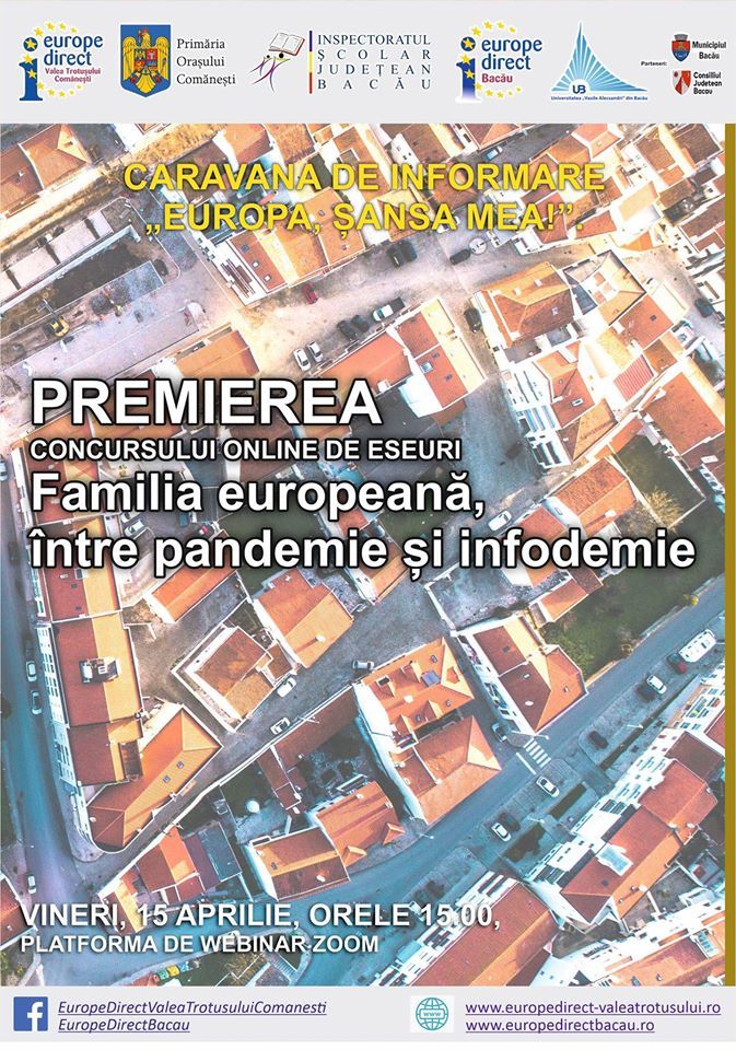 Concursul online de eseuri "FAMILIA EUROPEANĂ, ÎNTRE PANDEMIE ȘI INFODEMIE", inițiat de CIED Bacău, CIED Valea Trotușului Comănești și ISJ Bacău în cadrul caravanei "Europa, șansa mea" și-a premiat câștigătorii. Ne bucurăm că tema propusă a fost unanim apreciată și a generat argumente puternice din partea concurentilor de la peste 10 instituții școlare băcăuane.