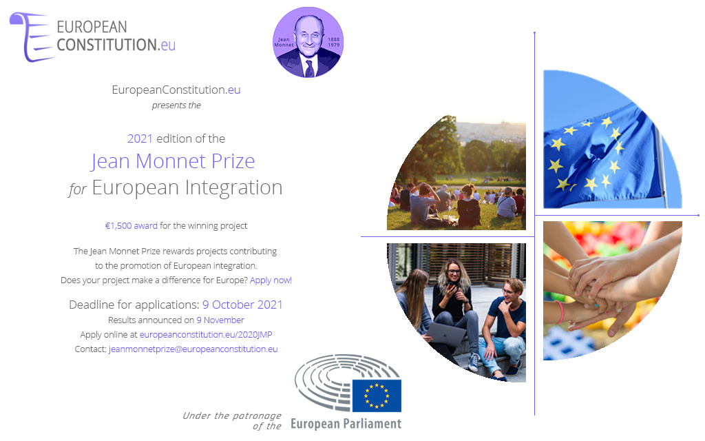 Perioada de depunere a candidaturilor pentru ediția din 2021 este cuprinsă între 9 septembrie și 9 octombrie 2021, ora 23:59 CET. Toate cererile trebuie depuse prin intermediul acestui website: https://europeanconstitution.eu/2021-jean-monnet-prize. Formularul de candidatură online va fi pus la dispoziție pe 9 septembrie.