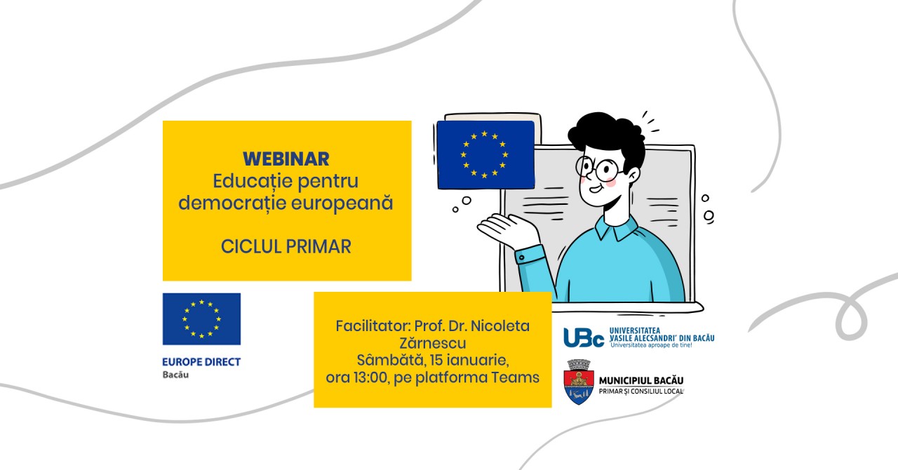 Sâmbătă, 15 ianuarie 2022, a avut loc webinarul intitulat ,,Educație pentru democrație europeană la ciclul primar", activitate organizată de Centrul EUROPE DIRECT Bacău. Evenimentul a fost moderat de către conf. univ. dr. Luminiţa Drugă, consiler de comunicare al Europe Direct Bacău şi conf. univ. dr. Nadia-Nicoleta Morăraşu, coordonator al Europe Direct Bacău. Facilitatorul webinarului de astăzi a fost prof. dr. Nicoleta Zărnescu. Locul de întâlnire a fost platforma Microsoft Teams, iar printre participanți s-au numărat aproximativ 100 de cadre didactice, de diferite specializări, acestea fiind interesate de lărgirea sferei de cunoaștere în privinţa unor aspecte actuale legatede diferite acțiuni și evenimente desfășurate de Uniunea Europeană. Participanţilor le-au fost prezentate două ghiduri, auxialiare cu caracter didactic întocmite de doamna prof. Zărnescu, conţinând surse de informare cu privire la diverse activităţi ce ar putea fi desfăşurate la clasă, în proiecte sau activităţi extracurriculare, cu elevi de diferite vârste. Printre sugestiile oferite în cele două ghiduri se regăsesc activităţi menite să dezvolte capacităţile cognitive şi relaţionale ale şcolarilor, prin raportare la valorile Uniunii Europene.