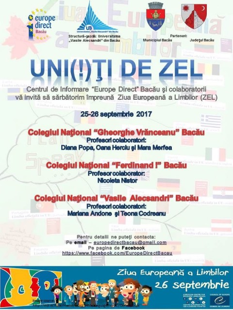 Centrul de Informare "Europe Direct" Bacău şi colaboratorii de la Colegiile Nationale "Gheorghe Vranceanu", "Vasile Alecsandri" si "Ferdinand I" din Bacau vă invită să sărbătorim impreuna Ziua Europeană a Limbilor (ZEL) 2017!